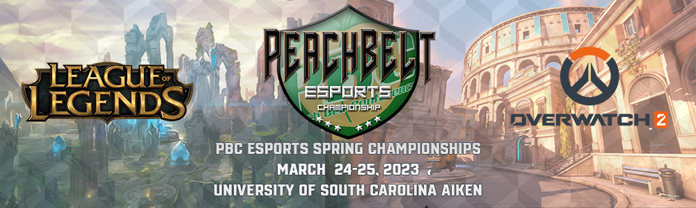 2023 Peach Belt Conference Spring Esports Championships Hosted by the University of South Carolina Aiken • Aiken, S.C. Presented by TICKETS MAPS & DIRECTIONS (all events will be held in the Etherredge Center at USCA) Live Stream - All League of Legends will be streamed here. All Overwatch streamed here. Tournament Schedule Photo Gallery Live Stream Live Stream Friday, March 24 Friday, March 24 12:00 pm Quarterfinal #1 #2 North Georgia 2 #7 West Georgia 0 1:00 pm Quarterfinal #1 #3 North Georgia 3 #6 Missouri Western State 1 2:30 pm Quarterfinal #2 #4 Missouri Western 0 #5 Columbus State 2 3:00 pm Quarterfinal #2 #2 Kennesaw State 3 #7 USC Aiken 0 5:00 pm Quarterfinal #3 #3 Kennesaw State 2 #6 Montevallo 0 5:00 pm Quarterfinal #3 #1 Converse 3 #8 Montevallo 1 7:30 pm Quarterfinal #4 #1 Florida Southern 2 #8 FSU Panama City 0 7:00 pm Quarterfinal #4 #4 Columbus State 3 #5 Florida Southern 0 Saturday, March 25 Saturday, March 25 10:00 am Semifinal #1 #2 North Georgia 1 #3 Kennesaw State 2 11:00 am Semifinal #1 #3 North Georgia 0 #2 Kennesaw State 3 12:30 pm Semifinal #2 #1 Florida Southern 2 #5 Columbus State 0 1:00 pm Semifinal #2 #1 Converse 3 #4 Columbus State 0 3:00 pm Champions Division Final #1 Alma 2 #2 Florida Southern 0 3:00 pm Champions Division Final #1 Georgia College 3 #2 Kennesaw State 1 5:30 pm Championship Match #3 Kennesaw State 0 #1 Florida Southern 2 5:00 pm Championship Match #2 Kennesaw State 0 #1 Converse 3
